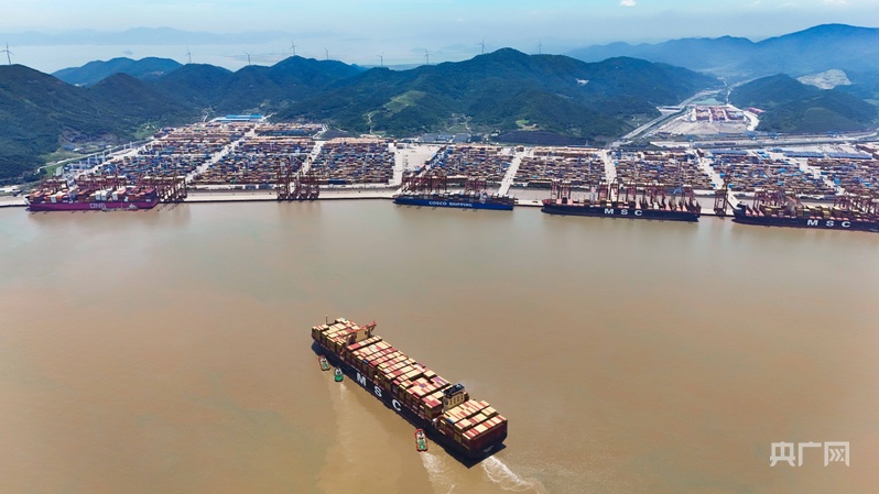 滿載貨物的“地中海洛雷托”號正緩緩靠泊寧波舟山港(央廣網記者 尚天宇 攝)