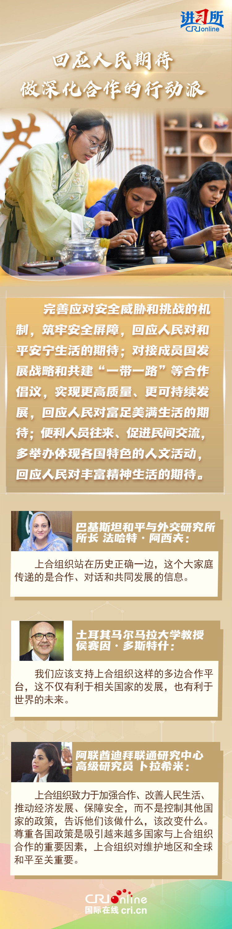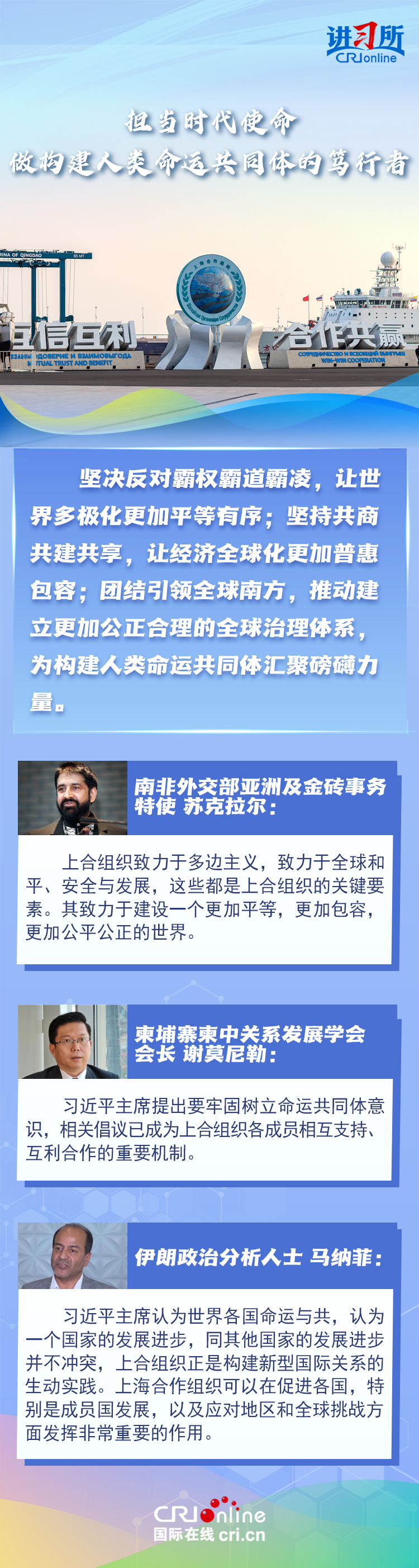 “讓‘上海精神’持續照亮構建上海合作組織命運共同體之路。”上海合作組織成立24年來,始終秉持“上海精神”,成功走出了一條順應時代潮流、契合各方需求的區域合作道路,樹立起新型國際關系的典范。在國際人士眼中,上海合作組織站在歷史正確一邊,致力于建設一個更加平等,更加包容,更加公平公正的世界,對維護地區和全球和平至關重要。