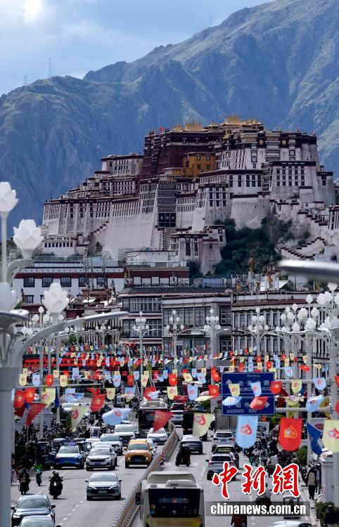 8月19日,隨著西藏自治區成立60周年慶?;顒优R近,拉薩氛圍濃。圖為拉薩街頭彩旗飄揚。中新社記者 李林 攝
