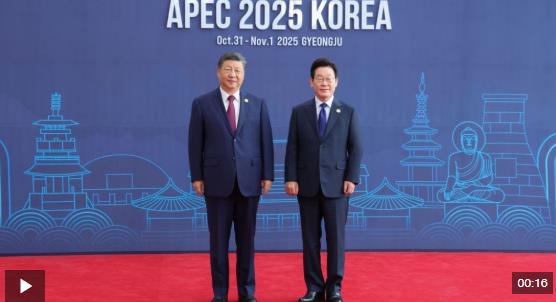 習近平主席抵達時,韓國總統李在明熱情迎接。兩國元首握手、合影,留下珍貴的“APEC瞬間”。隨后,兩位領導人微笑交談,共同步入會場。