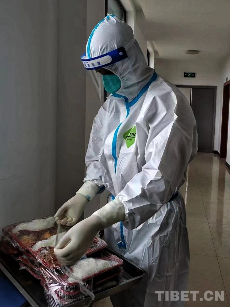 圖為瓊結縣藏醫院醫護人員在瓊結縣產業園隔離點給隔離人員送飯