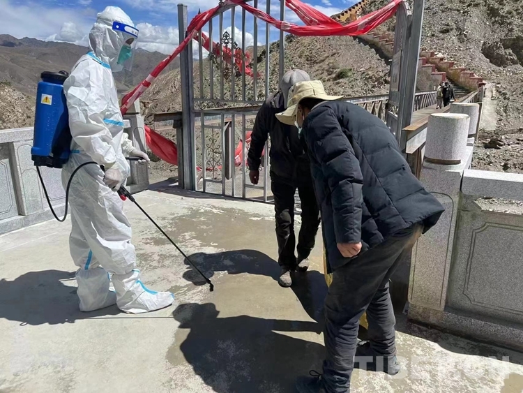 圖為瓊結縣藏醫院醫護人員在瓊結縣下水鄉唐布齊村做消殺工作