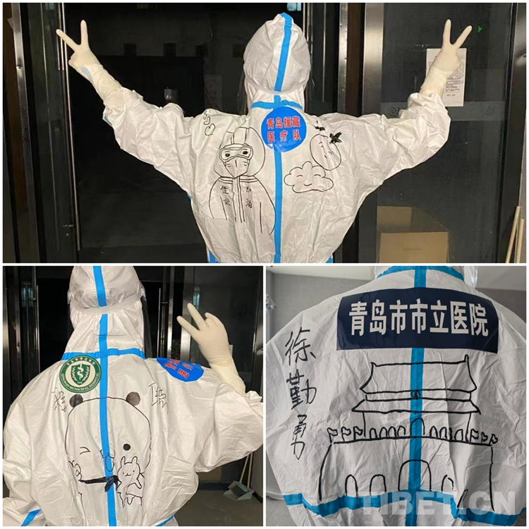 圖為青島“大白”們身著漫畫“戰(zhàn)袍”在日喀則戰(zhàn)“疫”一線合影留念