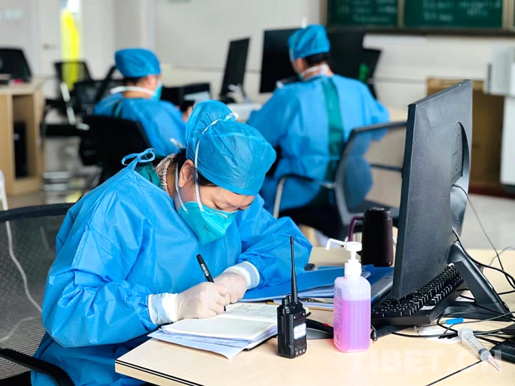 圖為拉薩市第二座方艙醫院護理隊隊長央宗在記錄一天的重點工作 攝影:次仁卓瑪