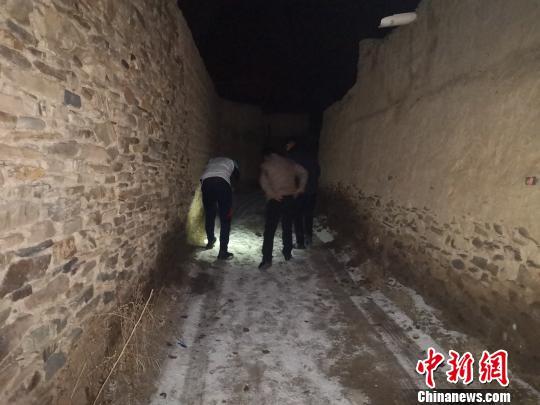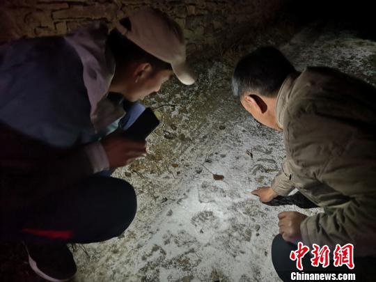 圖為青海省玉樹州稱多縣環境保護和林業局工作人員沿雪豹留下的腳印找尋蹤跡。 鐘欣 攝