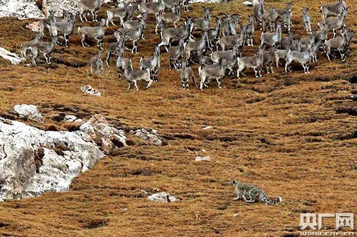 雪豹向巖羊群發起攻擊。央廣網發 馮剛 攝
