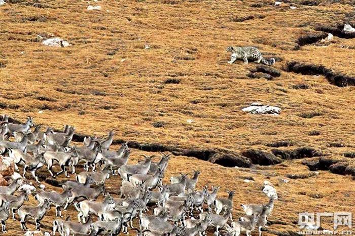 雪豹向巖羊群逼近。央廣網發 馮剛 攝