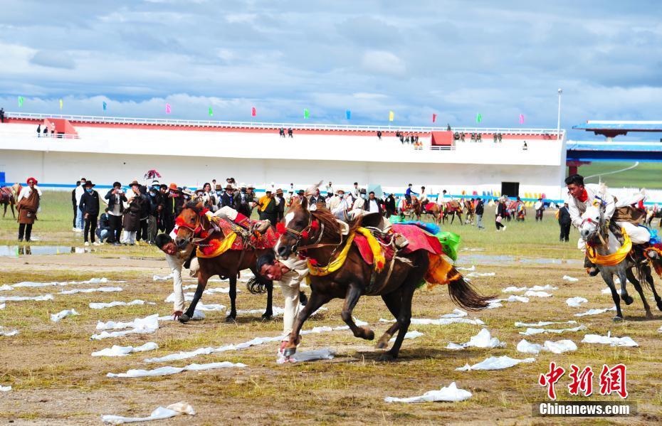 8月11日,藏北騎手表演跑馬拾哈達。8月10日,2020年那曲羌塘恰青格薩爾賽馬藝術節在西藏那曲市開幕。中新社記者 張偉 攝