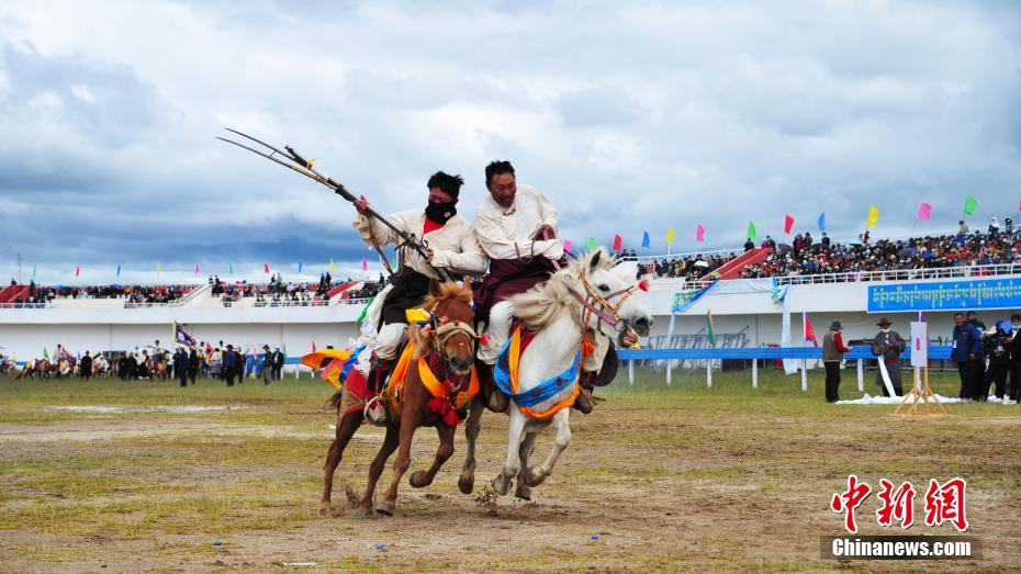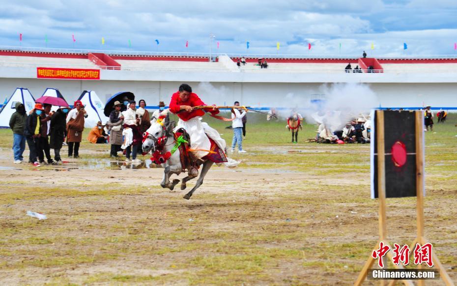 8月11日,藏北騎手表演跑馬射擊。8月10日,2020年那曲羌塘恰青格薩爾賽馬藝術節在西藏那曲市開幕。中新社記者 張偉 攝