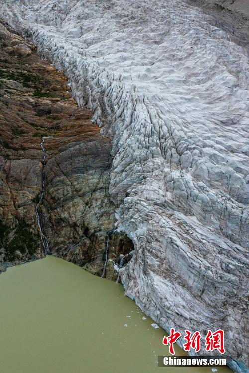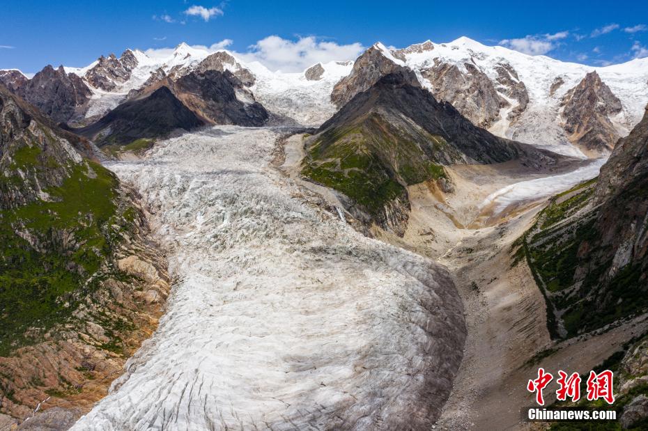 約雄冰川距離巴青縣城約85公里,冰川所在區域屬于國家級濕地保護區,主要由冰川下游冰緣區的湖泊水域、河流、沼澤化草甸及流域匯水區的部分水源林地組成。圖為航拍約雄冰川。 何蓬磊 攝