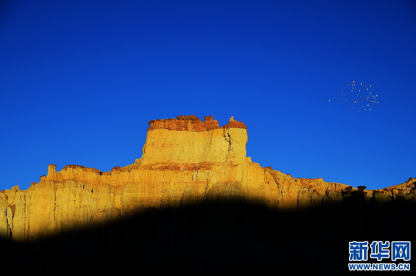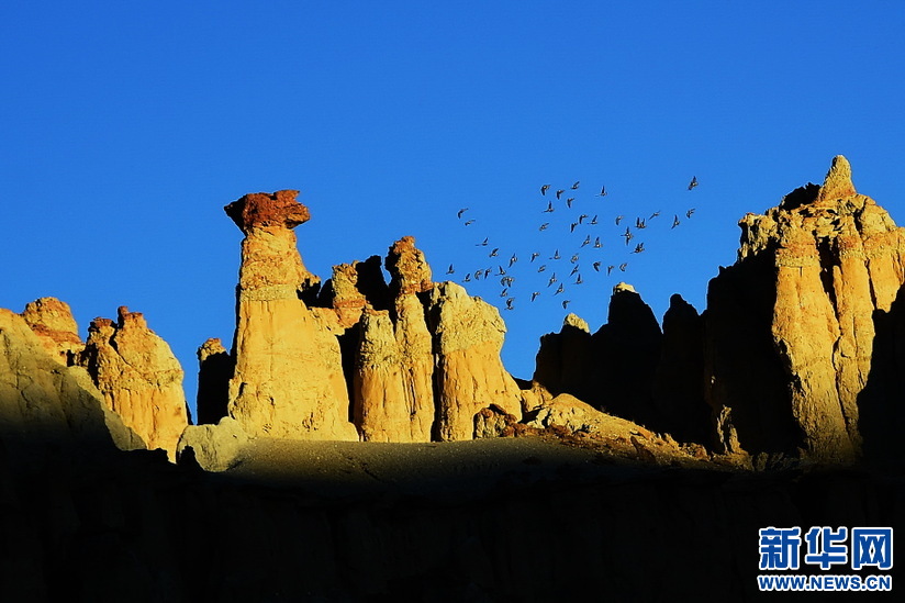 一群鳥兒飛過朝陽照耀下的土林(10月17日攝)。新華網 張宸攝