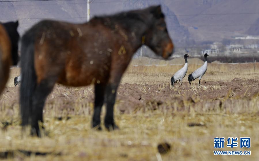 棲息在林周縣卡孜鄉農田里的黑頸鶴(12月12日攝)。新華社記者 張汝鋒 攝