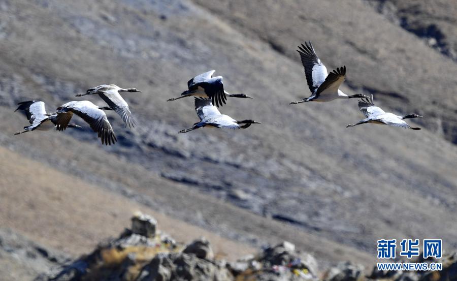 黑頸鶴在林周縣黑頸鶴自然保護區上空飛翔(12月12日攝)。新華社記者 黃豁 攝