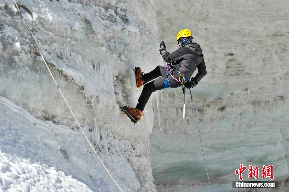 西藏拉薩河谷1號冰川(廓瓊崗日冰川)景區將與2021年4月正式全面開放,洛堆峰雪山攀登項目也將正式啟動。圖為登山愛好者進行攀登訓練。(資料圖片)中新社發 貢嘎來松 攝