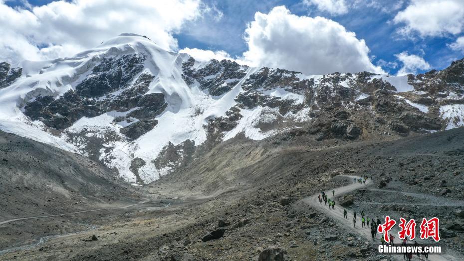 西藏拉薩河谷1號冰川(廓瓊崗日冰川)景區將與2021年4月正式全面開放,洛堆峰雪山攀登項目也將正式啟動。資料圖為登山愛好者攀登洛堆峰。(無人機拍攝)中新社發 貢嘎來松 攝