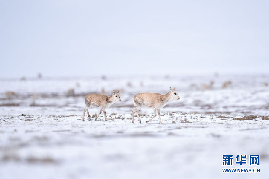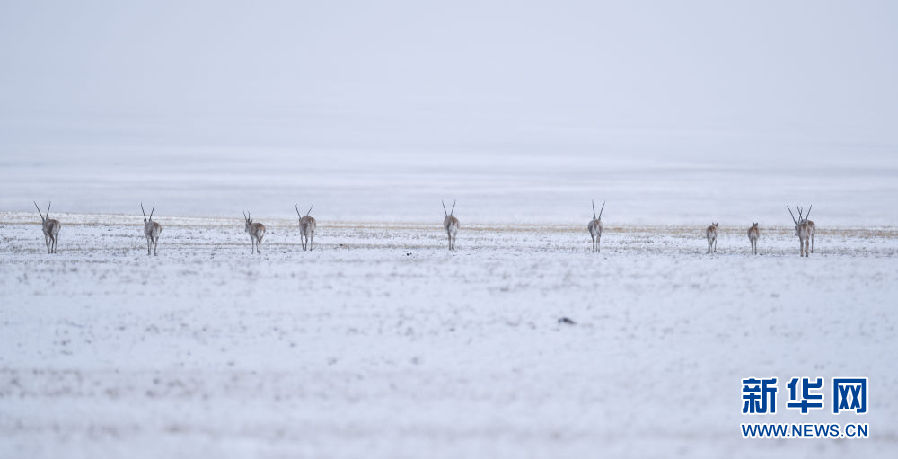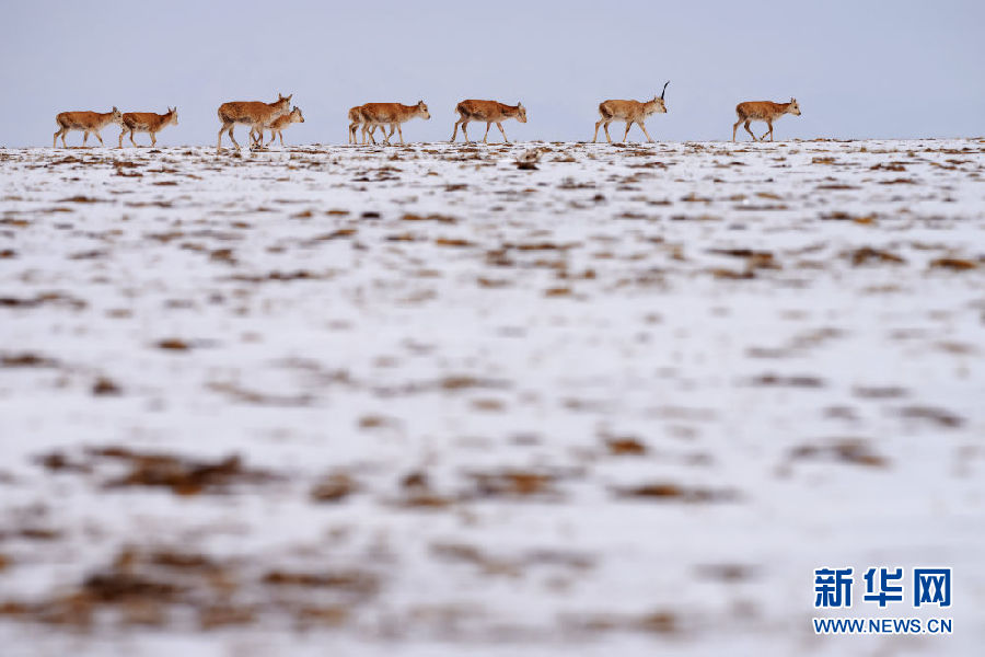 近日,可可西里迎來降雪,大量藏羚羊匯聚在可可西里五道梁地區,踏上遷徙之路。