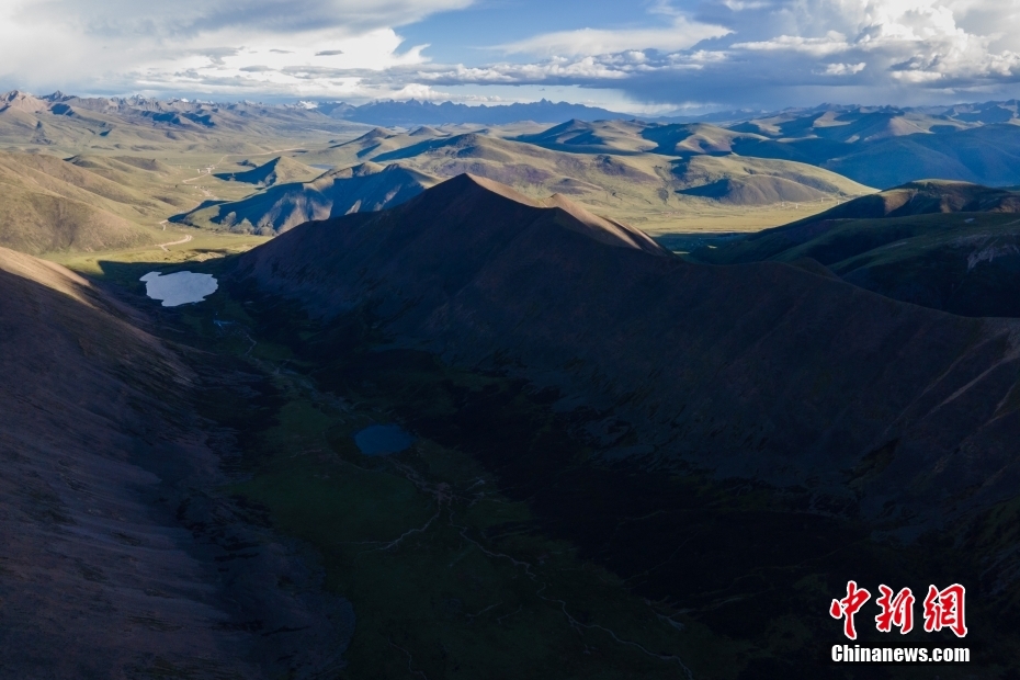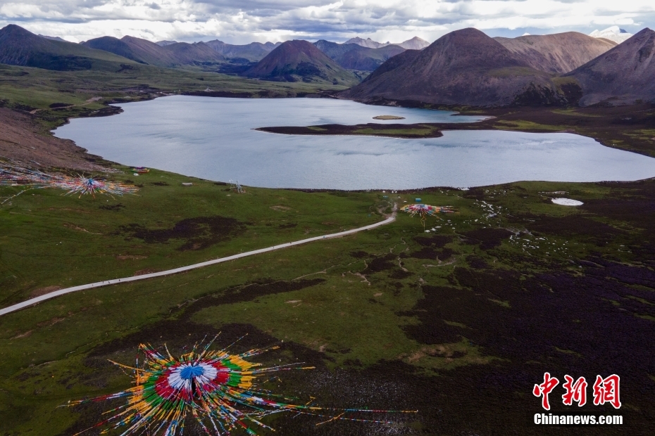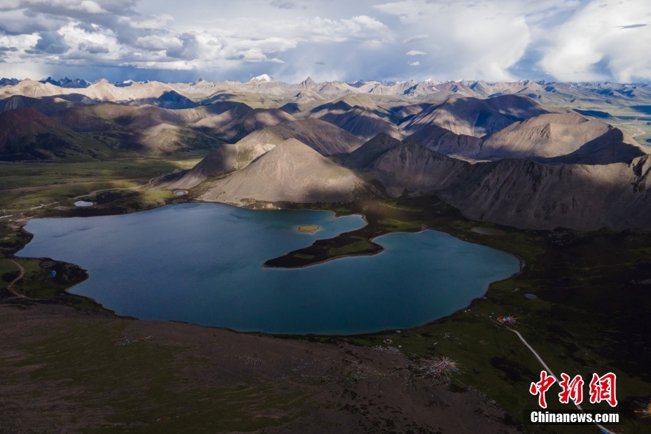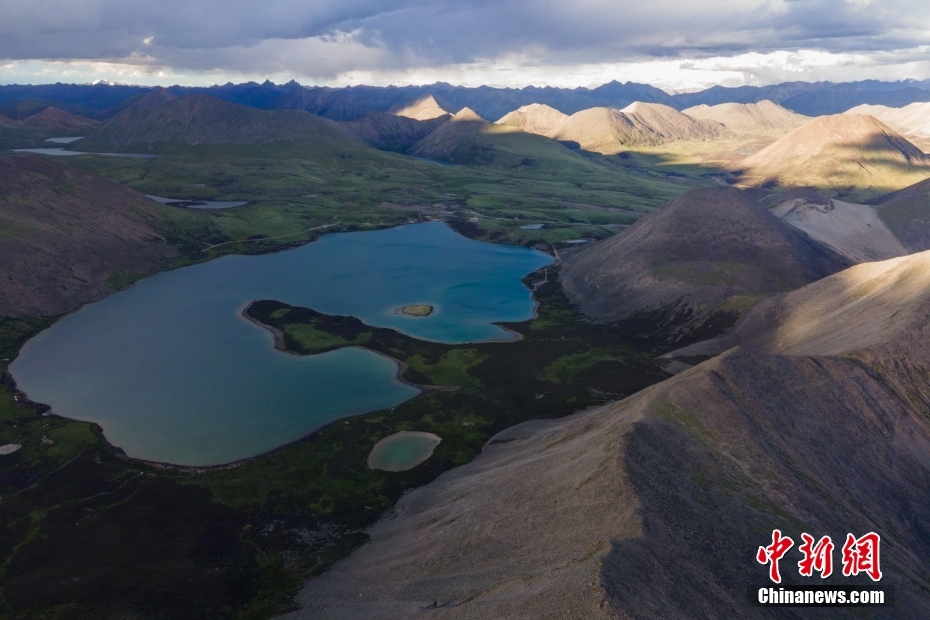 6月23日,思金拉措湖邊高原山脈風光。思金拉措位于西藏墨竹工卡縣日多鄉,海拔4500多米,周邊群峰簇擁,地形猶如聚寶盤,不少民眾將其稱為西藏的“財神湖”。(無人機照片) 中新社記者 江飛波 攝