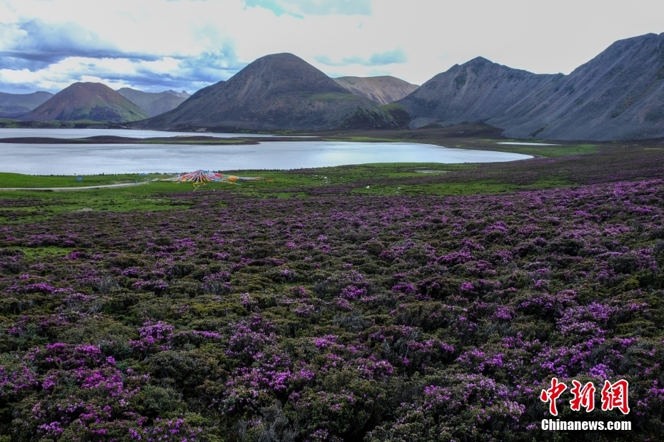 6月23日,思金拉措湖畔紫色鮮花盛開,景色秀麗。思金拉措位于西藏墨竹工卡縣日多鄉,海拔4500多米,周邊群峰簇擁,地形猶如聚寶盤,不少民眾將其稱為西藏的“財神湖”。 中新社記者 江飛波 攝