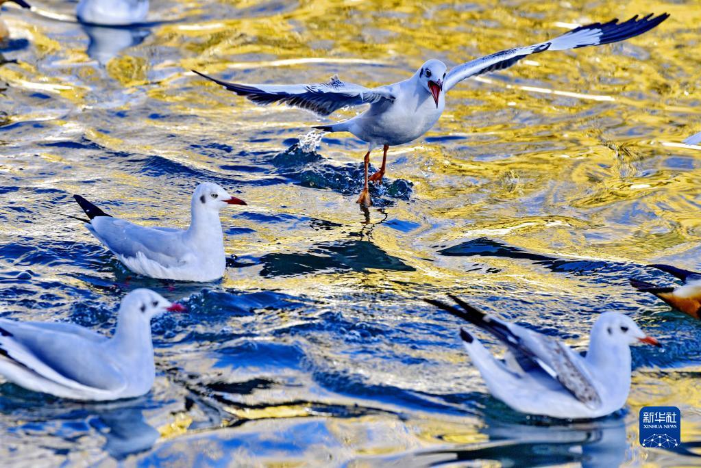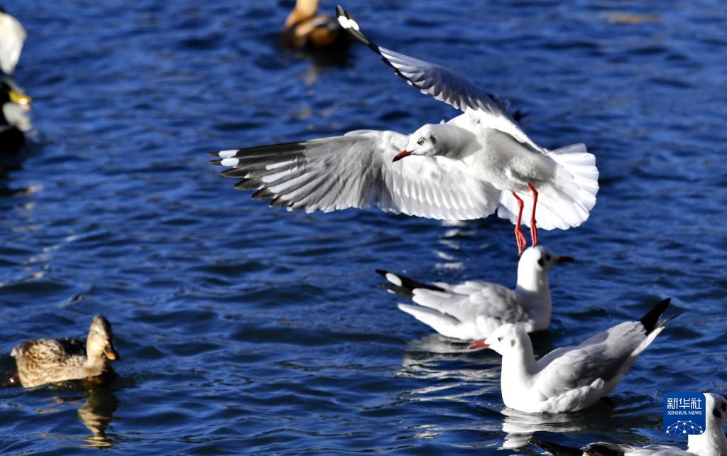 11月17日,紅嘴鷗在龍王潭里嬉戲。新華社記者 張汝鋒 攝