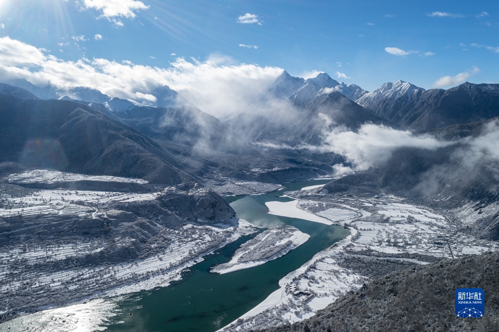 當日,西藏林芝市米林縣派鎮雅魯藏布大峽谷附近普降瑞雪,銀裝素裹的雅魯藏布江和南迦巴瓦峰顯得格外壯美。