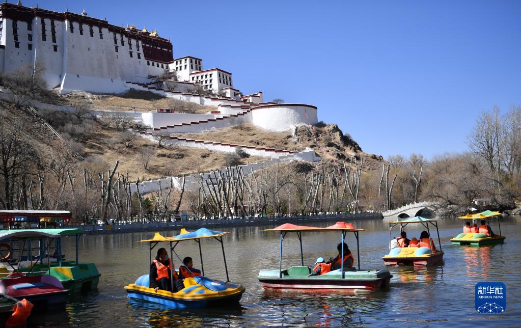 3月20日,在布達拉宮腳下的龍王潭公園內,游客乘船游玩。新華社記者 覺果 攝