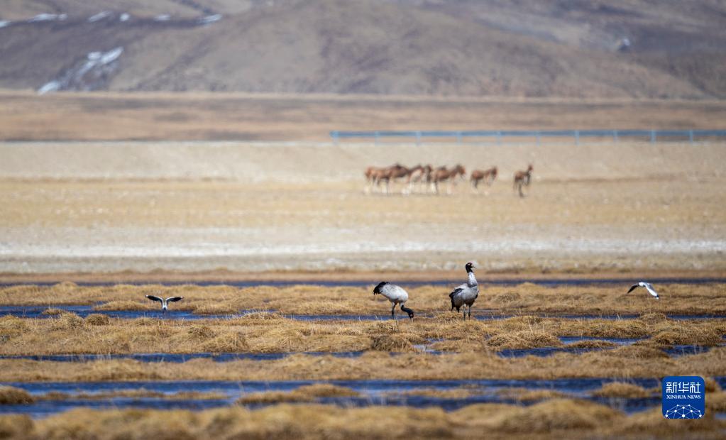4月22日,黑頸鶴在西藏阿里地區普蘭縣境內棲息。新華社發(劉曉東攝)