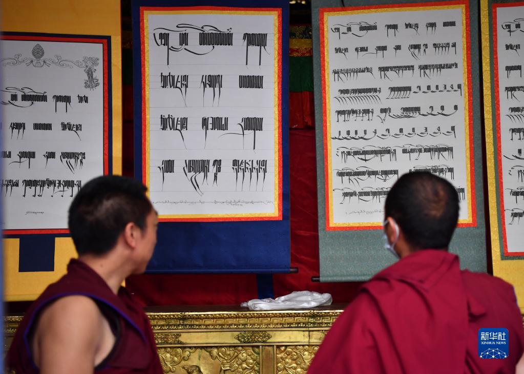 當天,西藏拉薩大昭寺舉行第三屆藏文書法展。50多名僧人創作的120多幅藏文書法作品,展示了不同字體書寫的藏文之美。