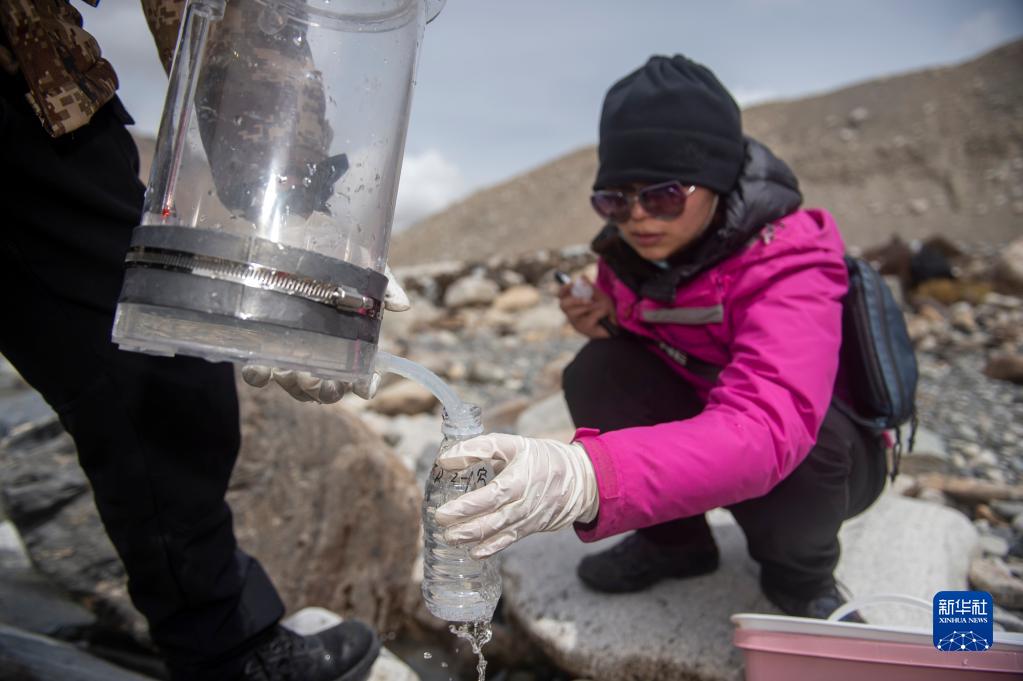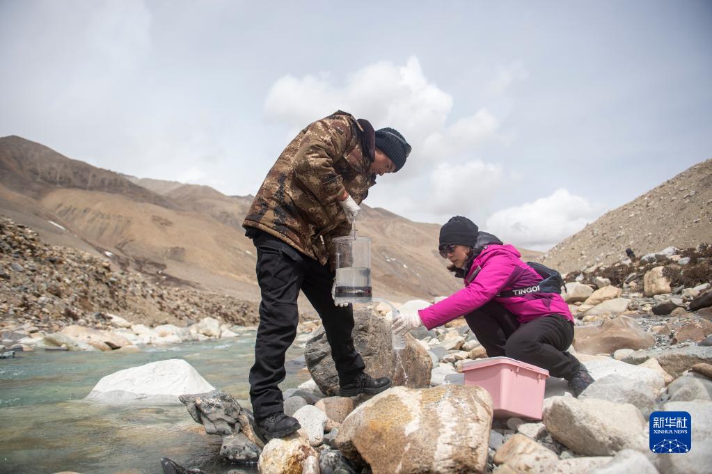 在東絨布冰川區域,科研人員進行微生物指標水樣采集(4月30日攝)。新華社記者 旦增尼瑪曲珠 攝