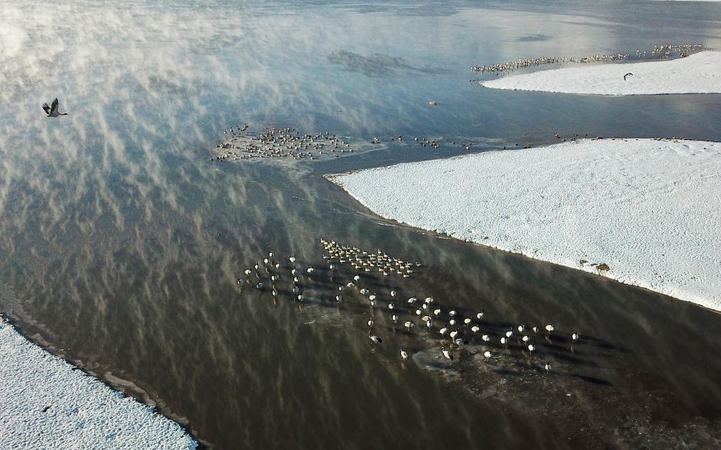 這是在拉薩市林周縣虎頭山水庫拍攝到的黑頸鶴(2月22日攝,無人機照片)。新華社記者 姜帆 攝