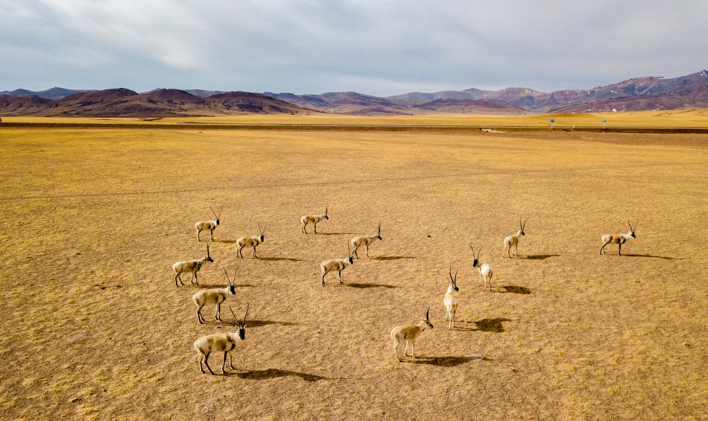 這是在阿里地區改則縣拍攝到的藏羚羊(4月13日攝,無人機照片)。公報顯示,藏羚羊種群數量由20世紀最低谷時的7萬余只增至30萬余只。新華社記者 姜帆 攝