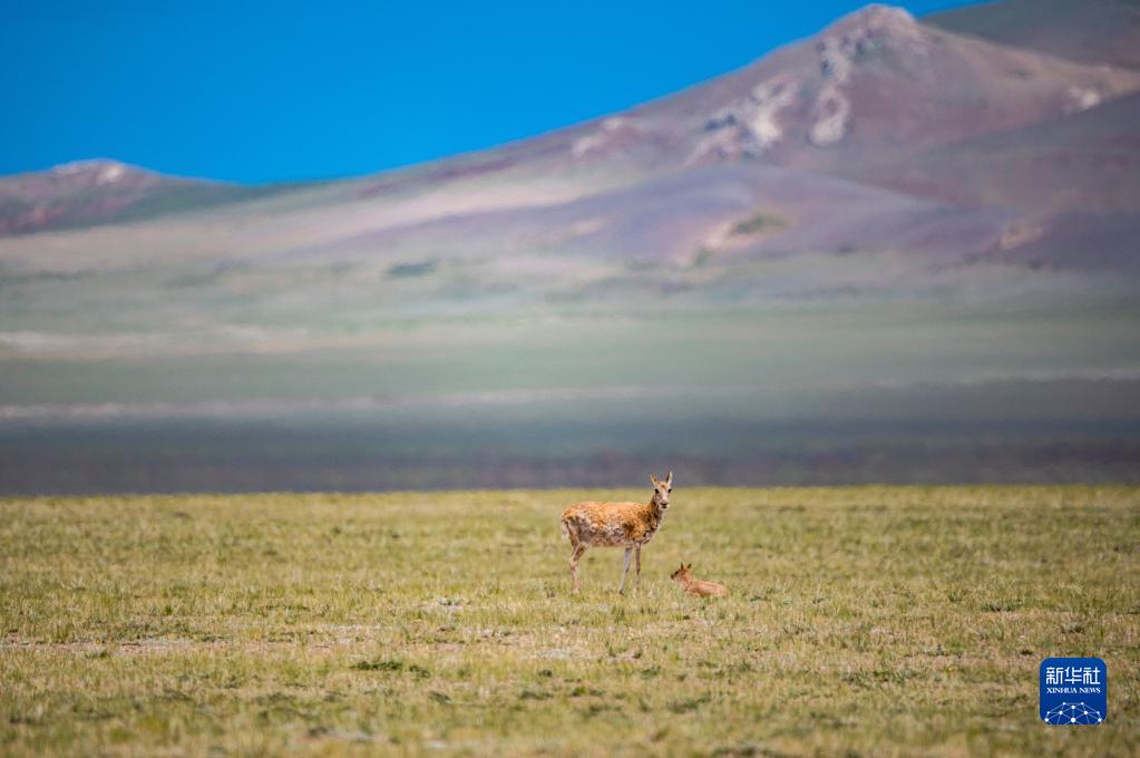 在羌塘國家級自然保護區,一只母藏羚羊在看護其幼崽(7月11日攝)。新華社記者 周荻瀟 攝