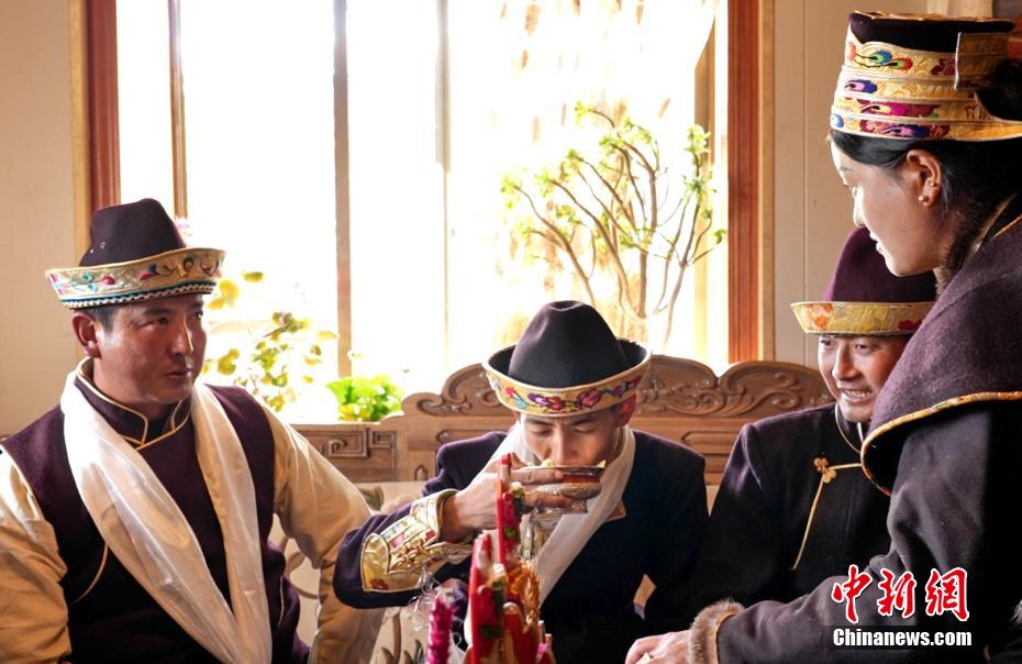 11月24日恰逢藏歷十月初一,西藏林芝迎來2023年工布新年,這是西藏最早的新年。工布新年以其悠久的歷史、鮮明的特色、豐富的內涵,于2006年被列入第一批西藏自治區非物質文化遺產保護名錄。圖為村民向客人敬酒。 阿仁 攝