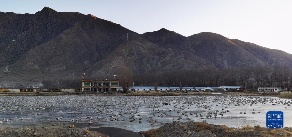 冬日清晨,拉薩市林周縣邊交林鄉的池塘里,大量斑頭雁、赤麻鴨等候鳥棲息(12月24日攝,手機照片)。新華社記者 沈虹冰 攝
