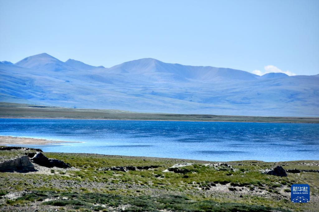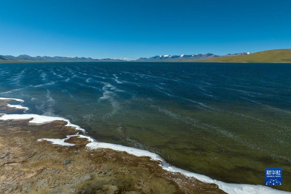 飛鳥從打加錯湖面掠過(無人機照片,8月30日攝)。新華社發(旦增努布 攝)