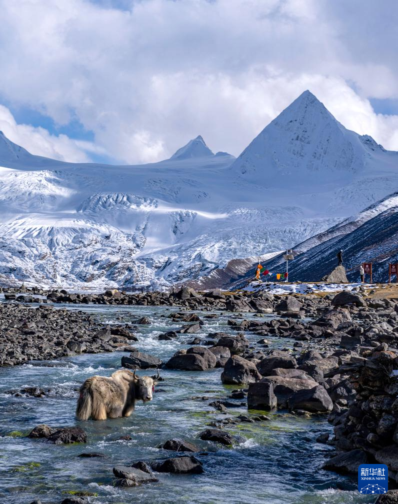 一頭牦牛站在薩普雪山腳下的河流里(10月28日攝)。新華社記者 孫非 攝