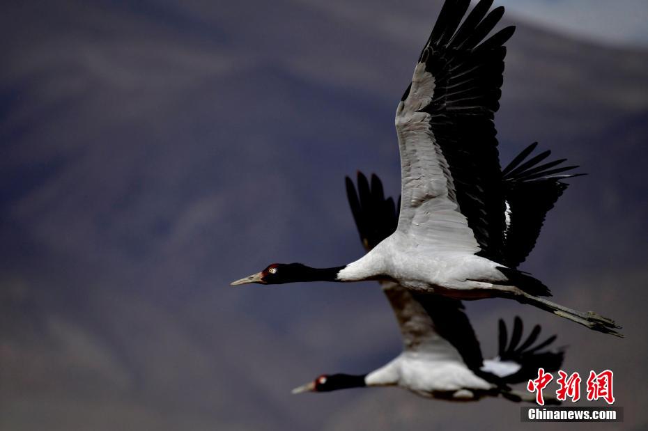 圖為11月21日,西藏日喀則市桑珠孜區邊雄鄉,黑頸鶴振翅高飛。李林 攝