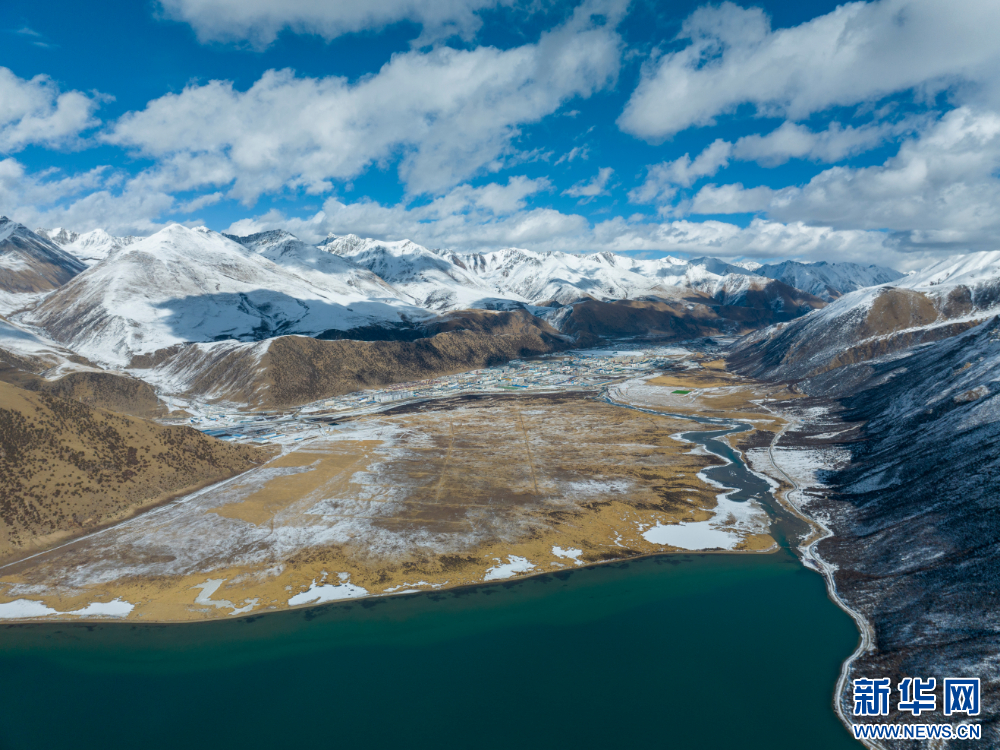嘉乃玉錯(cuò)與不遠(yuǎn)處的嘉黎縣縣城(12月10日攝,無(wú)人機(jī)照片)。新華網(wǎng) 旦增努布 攝