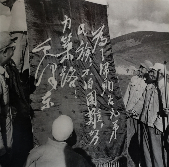 圖為毛主席的偉大號召——“為了幫助各民族兄弟,不怕困難,努力筑路!”鼓舞著指戰員們參加修筑公路的戰斗意志。翻拍:李元梅