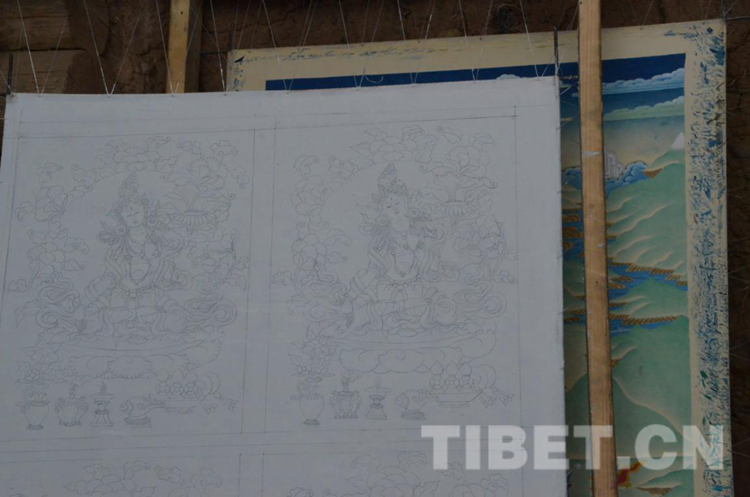 除了現場正在繪畫的3名學徒外,西熱秋久還有其他14名徒弟,他們大都是村里的建檔立卡戶。自2016年起,經駐村工作隊和村“兩委”研討、建檔立卡戶同意后,最終扶持本村的致富帶頭人西熱秋久成立了唐卡繪制農牧民專業合作社,定為村里的扶貧產業,建檔立卡戶可以來此學習,成為學徒后在這里學習唐卡繪制,吃住都在這里并能獲得一定的工資。