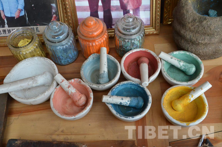 圖為西熱秋久繪制唐卡時所用顏料 攝影:歐帆