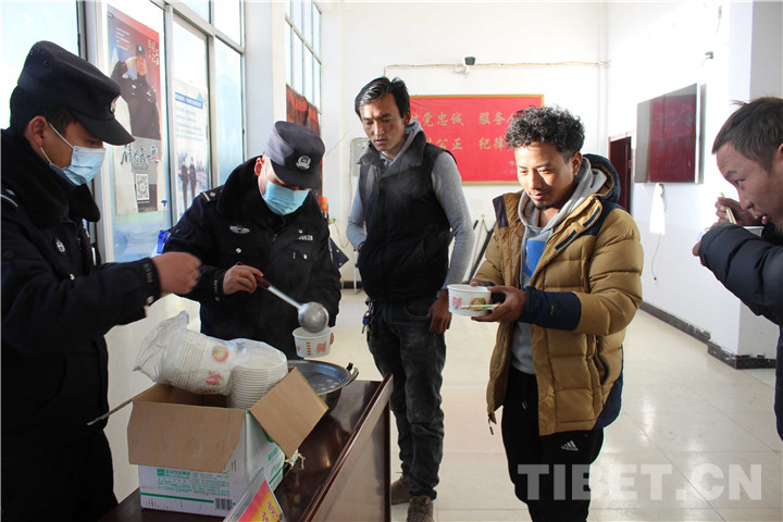 圖為執勤民警為群眾提供暖心食品