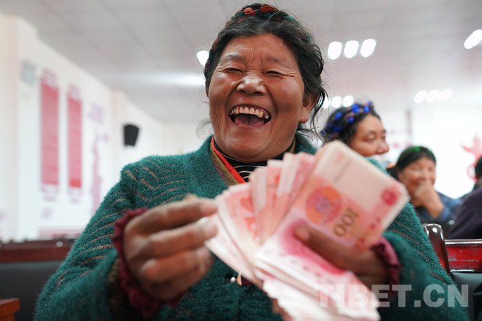令人激動的時刻來臨了?!岸M索朗曲珍,分紅26739元;二組支張,分紅6495元;一組朗杰曲珍,分紅2668元……”社員們?nèi)讲⒆鲀刹?,滿臉喜滋滋地依次上臺接過沉甸甸的分紅。他們在分紅發(fā)放清單上填上名字,摁上手印后,喜笑顏開地數(shù)著手里的錢。