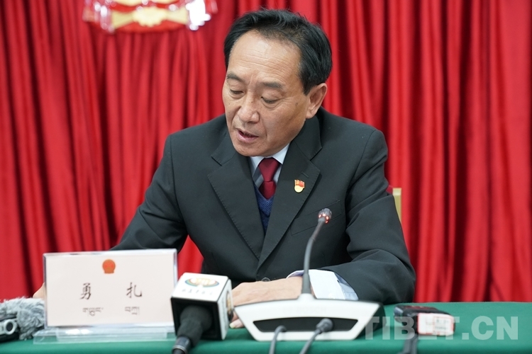 圖為西藏自治區人大法制委員會副主任委員勇扎介紹有關情況 攝影:王淑