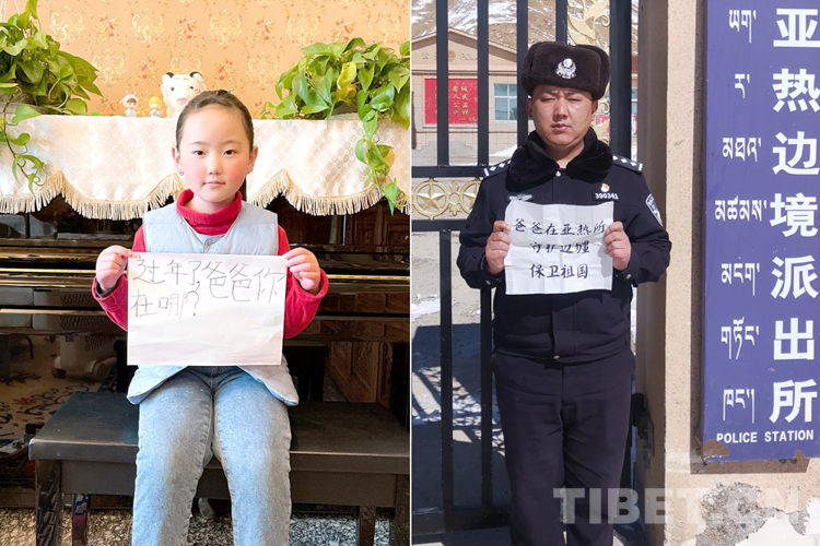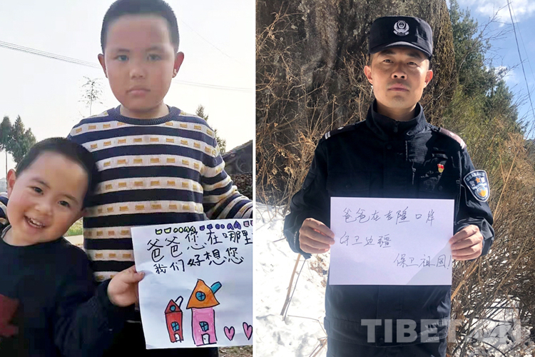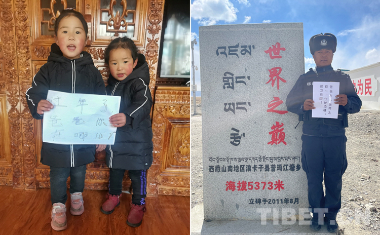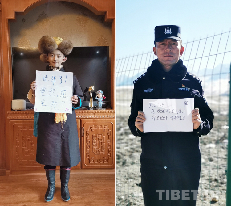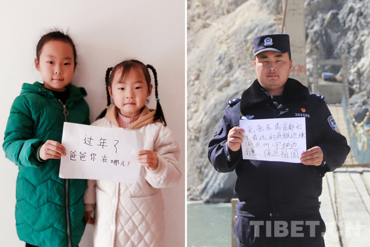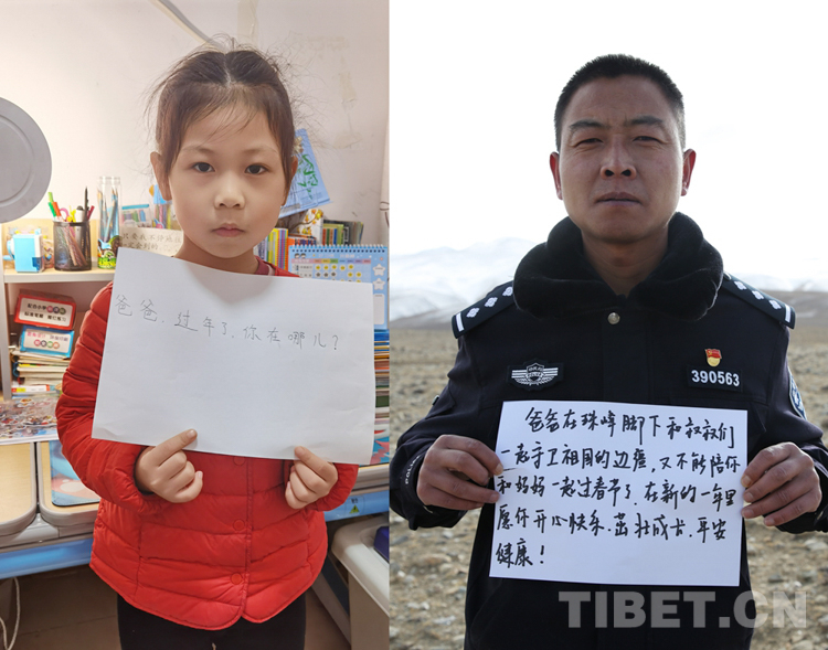 這是一張拼版照片,小女孩名叫旦增諾央,今年8歲,到現(xiàn)在還沒有和爸爸一起過過年。爸爸旦增尼瑪是日喀則邊境管理支隊亞熱邊境派出所所長,春節(jié)將至,他和戰(zhàn)友們堅守在海拔5300多米的中尼邊境一線,他通過這種方式表達(dá)對孩子的思念,相信慢慢長大的孩子一定能夠理解自己。