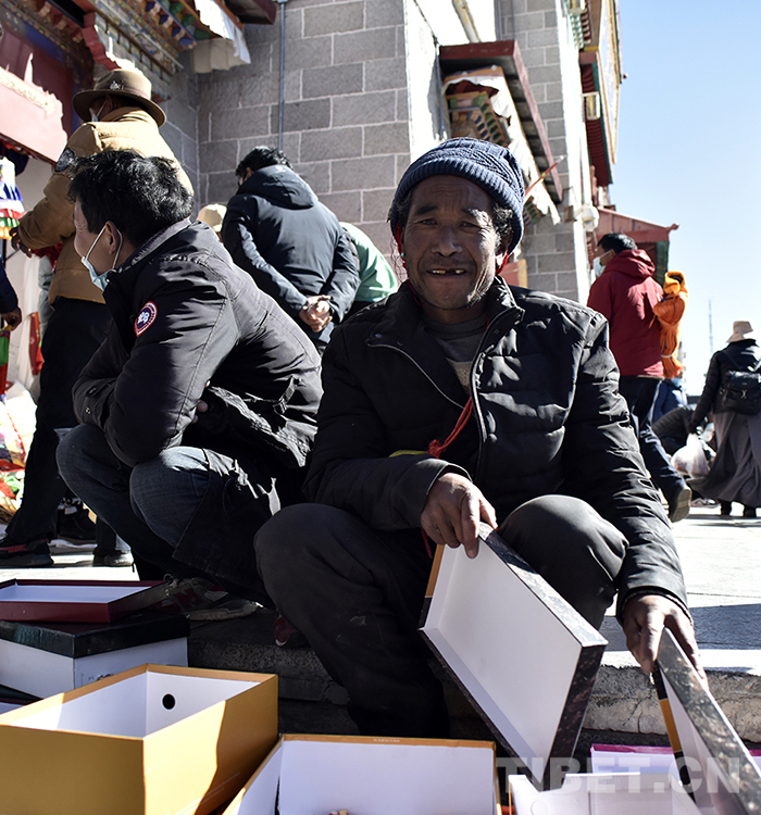 “酥油花怕熱,遇熱容易融化,所以我們一般都將酥油花裝在鞋盒子里,在陰面處售賣。”為了讓酥油花的賣相好點,他們只得“躲”著太陽。為此,只能穿厚點,抵御寒冷。