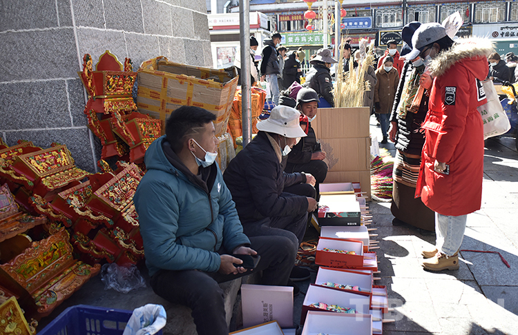 “阿佳,‘孜卓’要嗎?自己做的。”2月9日,記者在八廓商城走訪年貨市場時,遇上了來自日喀則市仁布縣普松鄉的頓旦和他的同伴們。四個人在八廓商城外的巷子邊擺了十多對酥油花,招攬生意。遇上過往人群多瞧一眼,他們總是耐心地揭開盛放酥油花的鞋盒蓋,期待著多賣出一對酥油花。
