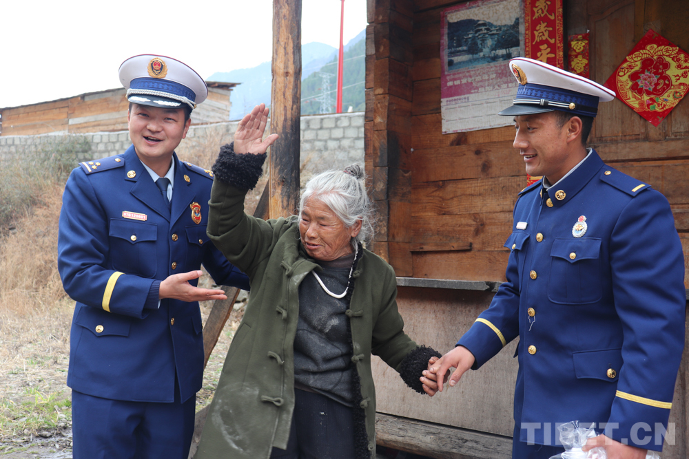 伴隨著冬日里溫暖的陽光,中隊指戰員代表帶著慰問品和節日的祝福來到了卓給阿媽家中,阿媽高興地迎接大家。指戰員們為阿媽張貼對聯、整理衣物、收拾衛生,給阿媽測量血壓,與阿媽拉家常,小屋沉浸在溫馨祥和的氛圍中。阿媽拉著指戰員的手說道:“謝謝你們經常來看我,我雖然沒有兒女,有你們的掛念,心里很滿足。”臨走時,指戰員再三叮囑阿媽有困難一定要及時聯系,她的“兒子”會經常來看望。