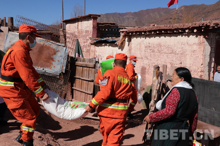 圖為卡若區森林消防中隊指戰員抬著慰問品送到困難群眾家中