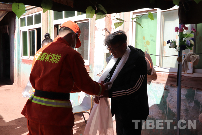 圖為卡若區森林消防中隊指戰員為群眾獻上哈達
