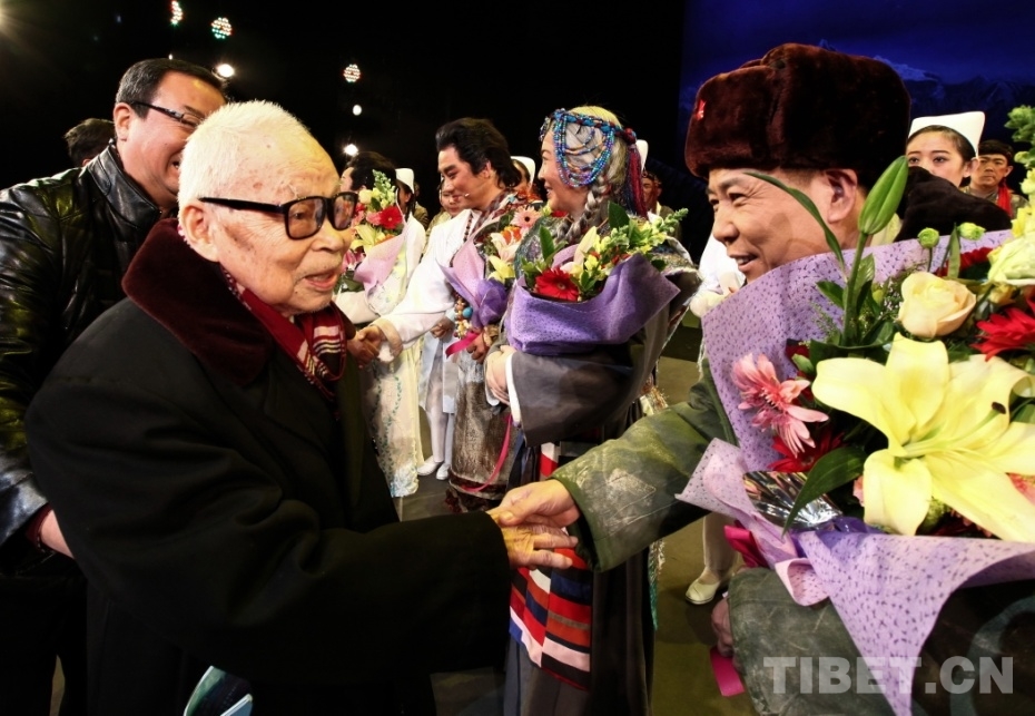圖為北京建藏援藏工作者協會學習指導老師陰法唐將軍在中國評劇院所創作的評劇《藏地彩虹》試演結束后,上臺握手祝賀(唐召明2017年12月10日攝)